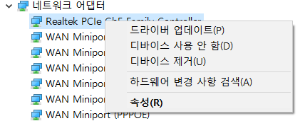 네트워크 어댑터 및 범용 직렬 버스 컨트롤러 선택: 네트워크 어댑터 목록에서 사용 중인 어댑터를 선택하고(보통은 제일 위에 거가 일반적입니다.) 마우스 오른쪽 버튼을 클릭하여 드라이버 업데이트를 선택해줍니다. USB 컨트롤러도 동일하게 업데이트를 진행해줍니다.
