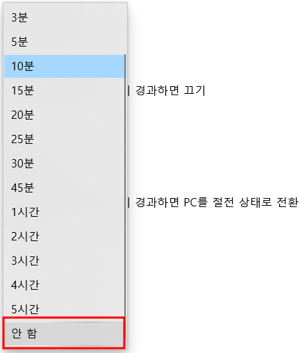 전원 관리 설정 변경: 컴퓨터 화면 아래 검색창에 " 전원 관리 " 를 입력하면 전원 및 절전 관리를 선택하면 설정 페이지창이 오픈됩니다. 여기서 전원 사용시 다음 시간이 경과하면 끄기의 옵션을 "안함"으로 체크해주었습니다.