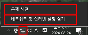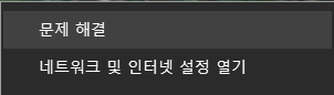 보통은 네트워크를 클릭해서 " 문제 해결 "을 눌러주면 대게는 알아서 처리하고 문제를 찾아 수정해 주는데 저는 그게 작동이 안되는 건지 해결되지 않고 있었습니다. 우측 하단에 네트워크 모양에 마우스 우클릭하면, 아래와 같이 창이 뜨는데, 여기서 문제 해결을 눌러주는 것이였죠. 그러나 안되어서 해결점을 찾고자 아래와 같이 단계별로 진행하면서 겪었던 내용을 말씀 드려보겠습니다.