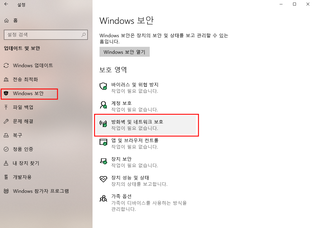 6. 방화벽 및 보안이 걸려있는지 확인하기